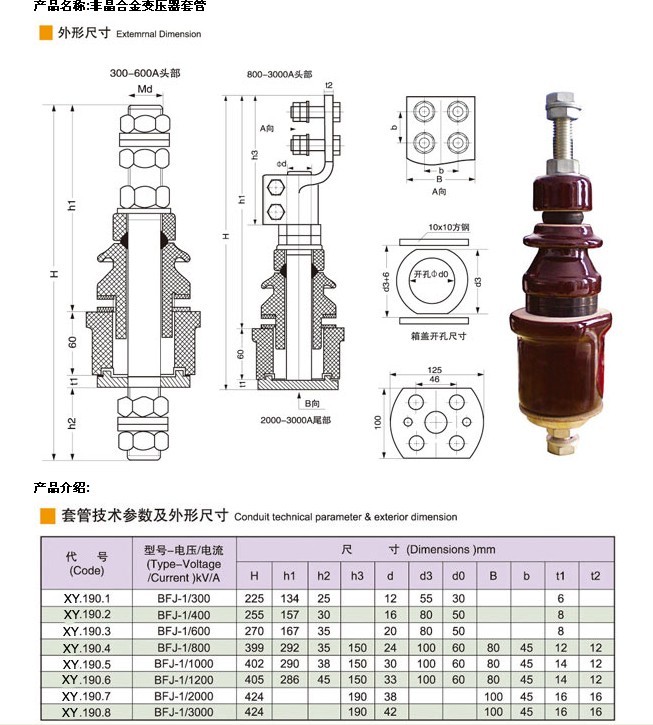 本产品主要包括导电杆、瓷瓶、"O"形密封圈、连接座等。规格有1KV、10KV、20 KV、35 KV、40.5 KV普通变压器套管、1KV、10KV、20 KV、35 KV、40.5 KV法兰式变压器套管,1KV、3 KV、12 KV、24 KV、36 KV、52 KV德标DIN套管,1KV、3 KV、12 KV、24 KV、36 KV、52 KV美标ANSI套管。
