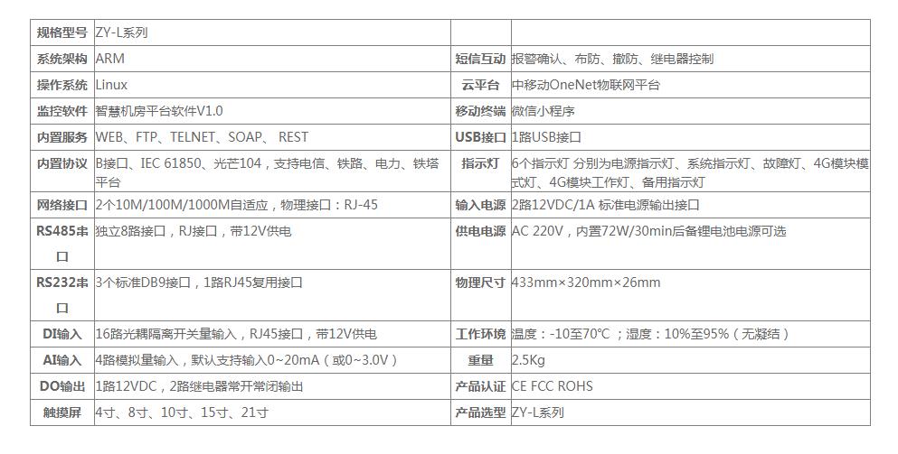 4G动力环境监控主机ZY-L系列是一款适应各种机房动力环境监控应用的高性能嵌入式一体化4G监控主机,支持4G网络传输,网络不再是瓶颈。监控对象: 市电、配电、UPS、蓄电池、精密空调、普通空调、温湿度、漏水、新风机、除湿机、消防、 烟雾、防雷、视频、门禁、红外人体探测、路由器、交换机、服务器等。报警方式:短信、电话、声光、邮件、微信、语音。